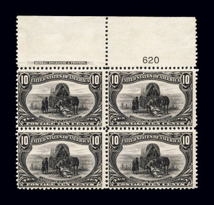 359 ogPB 290 image#290, 10c Trans-Mississippi, full top margin imprint and plate no. 620 block of four, crisp and intact, particularly intense rich color, o.g., faint trace of hinging in the top left stamp, fine and scarce as a full top plate block. (Image) $1,900.00