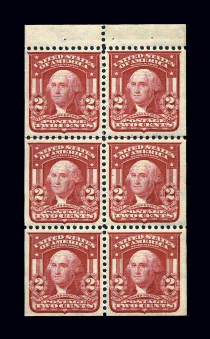 443 nhBP 319g image#319g, 2c Carmine, Ty. I, booklet pane of six, position E with horizontal guide line, brilliant "post office" fresh example, featuring about the nicest centering and margins possible on a booklet pane, radiant color, pristine o.g., n.h., extremely fine; seldom encountered this choice; 1998 PF certificate. (Image) $240.00