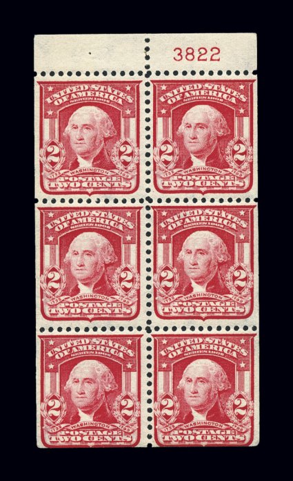 445 nhBP 319n image#319n, 2c Carmine Rose, booklet pane of six, from the scarce position D, with plate no. 3822 in the tab, nicely centered and fresh, o.g., n.h., very fine. (Image) $700.00