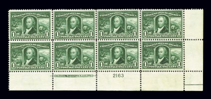 446 nhPB 323 image#323, 1c Louisiana Purchase, full bottom right corner margin imprint and plate no. 2163 block of eight, featuring excellent overall centering, especially for this large of a block, wonderfully fresh with deep rich color, o.g., n.h., small selvage crease in the extra non-plate pair at right, insignificant as the all important plate block of six is extremely fine and scarce thus. (Image) $640.00