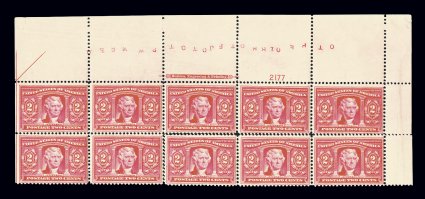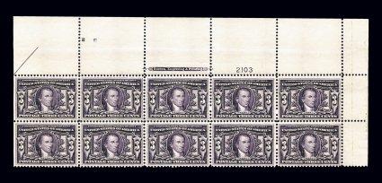 450 nhPB 325 image#325, 3c Louisiana Purchase, a marvelous quality full top left corner margin partial arrow, imprint and plate no. 2103 block of ten, being the two top rows of the pane with immense top selvage, possessing outstanding centering overall for an issue that seldom comes well centered, especially in such a large block, sumptuously rich color and a prooflike impression on immaculate paper, strong and fully intact perforations, unblemished o.g., n.h., extremely fine; a gem plate block. (Image) $2,500.00