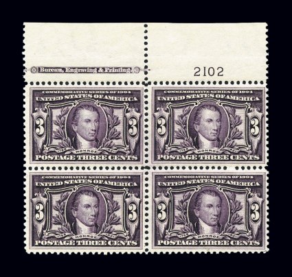 449 nhPB 325 image#325, 3c Louisiana Purchase, top margin imprint and plate no. 2102 block of four, fresh and crisp, sumptuously rich color and a detailed impression, well centered, immaculate o.g., n.h., very fine. (Image) $1,075.00
