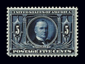 451 nh 326 image#326, 5c Louisiana Purchase, an extraordinary quality top sheet-margin imprint single, incredibly well centered within large margins, sumptuously rich color and a razor-sharp impression on bright white paper, even its perforations are uniformly intact all around, o.g., stamp n.h. (lightly hinged in ungummed portion of the selvage only), extremely fine; an exceptionally handsome and choice stamp; ex-Higgins. (Image) $225.00