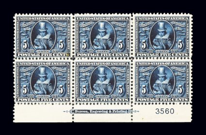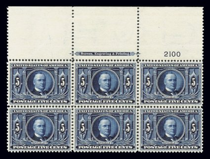 453 nhPB 326 image#326, 5c Louisiana Purchase, full top margin imprint and plate no. 2100 block of six, exceptionally well centered, luxuriously rich color and a deeply etched impression on especially bright paper, even its sheet selvage is unusually wide, pristine o.g., n.h., certificate mentions a natural indentation in the top right stamp which is very trivial, a very fine and exceedingly choice plate block; particularly elusive to find as a plate of six versus the more typically seen plate of four; 2005 PF certificate. (Image) $1,850.00