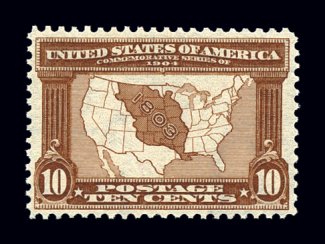 454 nh 327 image#327, 10c Louisiana Purchase, extraordinarily well centered, lovely rich color and a crisp detailed impression, o.g., n.h., extremely fine and choice; photocopy of a 1983 PF certificate for a block of four, this being the bottom right stamp, and a 2002 PF certificate for the single. (Image) $400.00