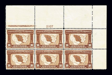 456 nhPB 327 image#327, 10c Louisiana Purchase, an impressive full top right corner margin imprint and plate no. 2107 block of six, consisting of the plate block of four plus the vertical corner pair, exceptionally well centered, especially the plate block with each stamp being beautifully centered, excellent color and impression on bright paper, o.g., n.h., light bends in the selvage and natural wrinkles in the left vertical pair, otherwise very fine-extremely fine and a handsome plate multiple. (Image) $3,050.00