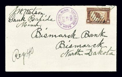 457 c 327 image#327, 10c Louisiana Purchase, well centered single tied by partial Sauk Rapids, Minn. duplex on registered cover to Bismarck, N.D., clear purple "Sauk Rapids, Minn/Oct 18, 1904" registry handstamp, a fresh cover and a very fine usage. (Image) Est. 150-200