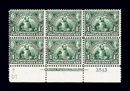458 ogPB 328 image#328, 1c Jamestown, bottom margin imprint and plate no. 3543 block of six, rather well centered for this notoriously difficult issue, deep color and impression, o.g., lightly hinged with some hinge reinforced perforations at bottom, nearly very fine for this. (Image) $300.00