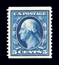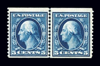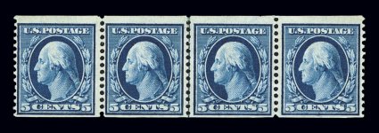 503 og 355 image#355, 5c Blue coil, perf. 12 vert., an exceptionally scarce guide line strip of four, particularly fresh, with rich luxuriant color and bright paper, nicely centered, o.g., lightly hinged, fine-very fine; 1987 PF certificate. (Image) $1,960.00+