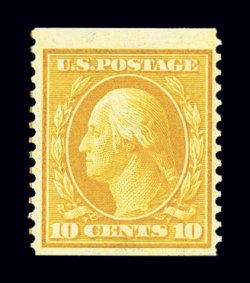 504 nh 356 image#356, 10c Yellow coil, perf. 12 vert., an incredibly fresh mint single of this coil rarity, possessing a glorious bright color that few others enjoy, well incised impression, far better centering than typically encountered, unblemished o.g. without a single gum bend or skip, never hinged, very fine; the extreme rarity of this stamp in never hinged condition cannot be overstated, as this is the first never hinged single of #356 we have ever offered in our auctions; 2001 PF certificate. (Image) $6,250.00