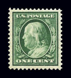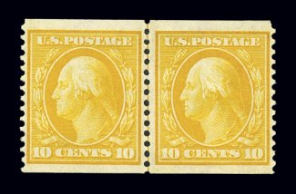 505 og 356 image#356, 10c Yellow coil, perf. 12 vert., a magnificent quality guide line pair, being in a condition which places it among the finest of the few genuine 1909 Ten Cent coil line pairs in existence, possessing outstanding physical qualities that would be impressive for a normal pair of this value, let alone a very rare line pair, including being incredibly well centered and margined, plus its color is especially intense and vibrant, strong impression on bright fresh paper, full clean o.g. that has been only lightly hinged, extremely fine; it could be a very long time before another gem #356 line pair makes its way onto the auction block; signed with very light "SS & CCO" (Scott Stamp & Coin Co.) handstamp, as well as being accompanied by a 2002 PF certificate. (Image) $13,000.00