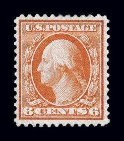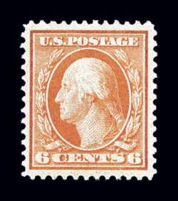 510 og 362 image#362, 6c Red orange on bluish paper, a premium quality mint example of this scarce bluish paper, being extraordinarily well centered within uncommonly large margins, wonderfully bright color, fresh o.g., very lightly hinged, extremely fine and choice; 1992 and 2003 PF certificates; ex-"Connoisseur" collection. (Image) $1,500.00