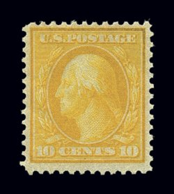 514 nh 364 image#364, 10c Yellow on bluish paper, an exquisite "post office" fresh example of this value, possessing spectacularly intense and vibrant color that must be seen in person to fully appreciate, quite well centered as well, with large margins and unusually crisp even perforations all around, flawless o.g., never hinged, very fine; a highly desirable single in rare never hinged condition; 1989 PSE certificate for a block of four, this being the left stamp, plus a 2005 PF certificate as a single; ex-Lewis. (Image) $4,500.00