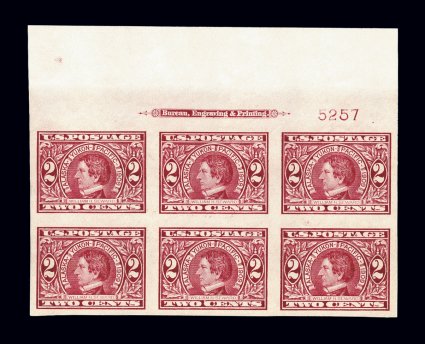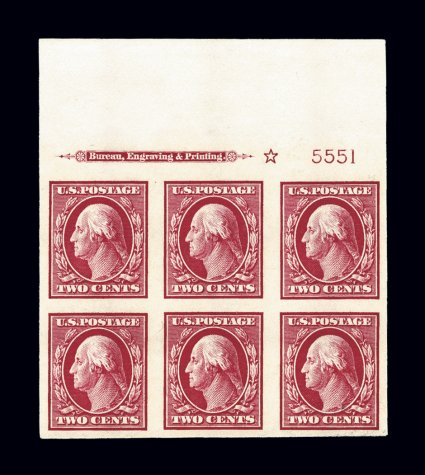 527 nhPB 384 image#384, 2c Carmine, imperforate, full top margin imprint, star and plate no. 5551 block of six, lavish margins all around, strong rich color and impression on bright paper, o.g., n.h., extremely fine. (Image) $200.00