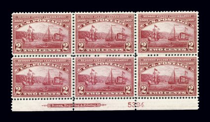 522 nhPB 372 image#372, 2c Hudson-Fulton, full bottom margin imprint and plate no. 5394 block of six, rich color, well centered overall, slightly weak vertical perfs., o.g., n.h., very fine. (Image) $425.00