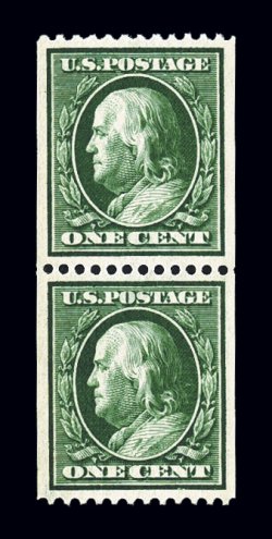 539 nh 392 image#392, 1c Green coil, perf. 8 1/2 vert., a highly desirable guide line pair, not only being extraordinarily well centered within large margins, but its color is spectacularly deep and luxuriant, while its impression in prooflike on bright white paper, unblemished o.g., n.h., extremely fine; 1978 and 2004 PF certificates. (Image) $425.00