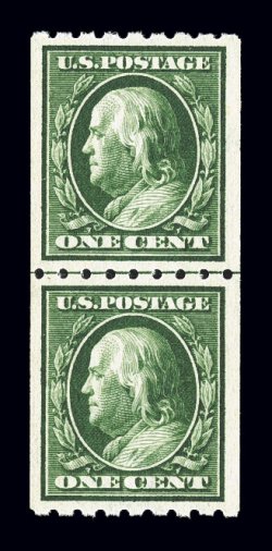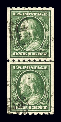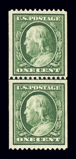 529 nh 385 image#385, 1c Green coil, perf. 12 horiz., guide line pair, well centered, strong rich color, o.g., n.h., very fine; a scarce line pair, especially in this premium never hinged condition; 2002 PF certificate. (Image) $1,000.00
