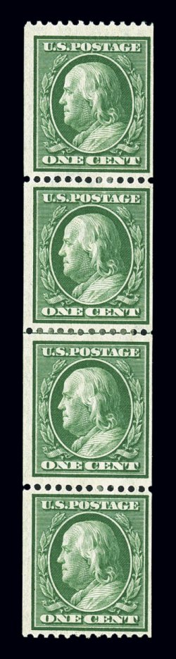 530 og 385 image#385, 1c Green coil, perf. 12 horiz., guide line strip of four, exceptionally fresh and bright, deep luxuriant color, attractive centering for this surprisingly difficult coil, o.g., h.r., fine-very fine. (Image) $530.00+