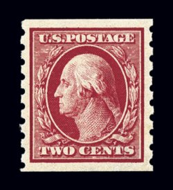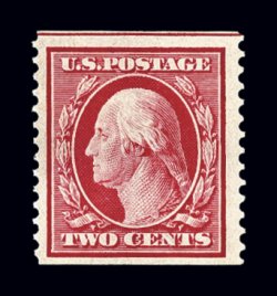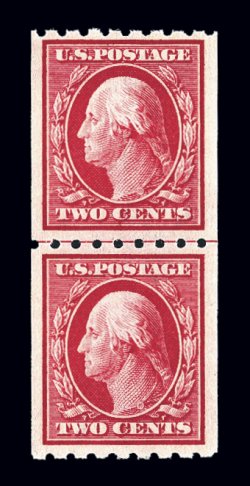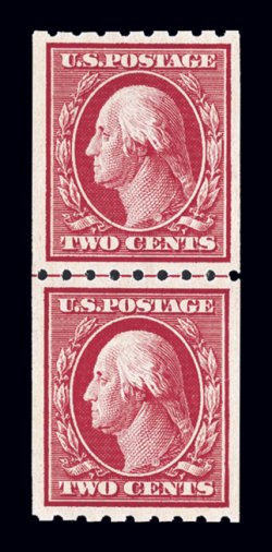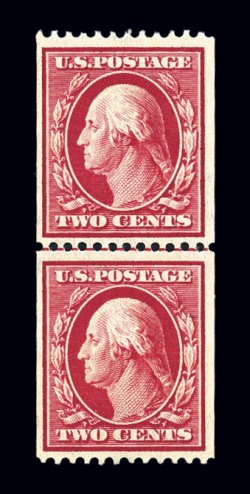 538 og 391 image#391, 2c Carmine coil, perf. 8 1/2 horiz., guide line pair, incredibly well centered within large margins, sumptuously rich color and a deeply etched impression on bright paper, o.g., current certificate states previously hinged on the top stamp but it is probably never hinged with a small natural gum skip, an extremely fine and choice guide line pair; 1989 APS and 2005 PF certificates. (Image) $260.00