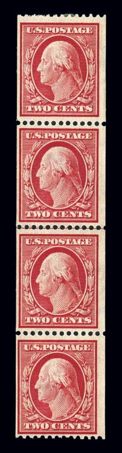 533 og/nh 386 image#386, 2c Carmine coil, perf. 12 horiz., amazingly rare guide line strip of four, exceptionally fresh with brilliant color, fairly well centered, o.g., h.r. on top stamp, line pair and bottom stamp n.h., several separated perforations at left in the middle and bottom rows, not at all unusual for genuine coils which are very fragile, otherwise fine-very fine and seldom found in guide line strips. (Image) $3,515.00+