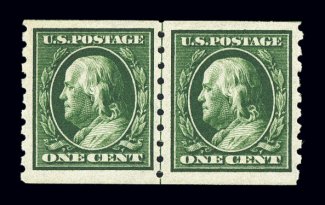 528 nh 385 image#385, 1c Green coil, perf. 12 horiz., select quality pair, extraordinarily well centered and margined, deep rich color and impression, pristine o.g., n.h., extremely fine; 2005 PF certificate and a 2005 PSE certificate (XF-Superb 95). (Image) $230.00