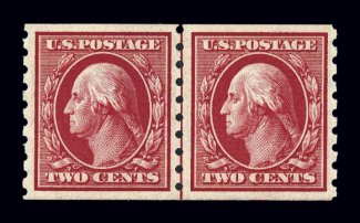 541 nh 393 image#393, 2c Carmine coil, perf. 8 1/2 vert., guide line pair, uncharacteristically well centered, deep rich color, o.g., n.h., choice very fine; a very scarce line pair in this select quality; 2004 PSE certificate. (Image) $650.00