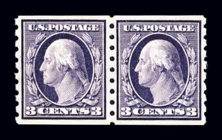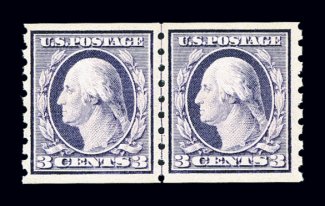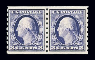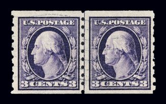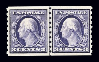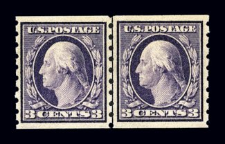 547 nh 394 image#394, 3c Deep violet coil, perf. 8 1/2 vert., "post office" fresh guide line pair, prooflike color and impression, nicely centered, immaculate o.g., n.h., fine-very fine; 1989 PF certificate for a line strip of four from which this pair was taken. (Image) $900.00