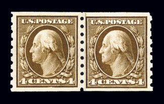 549 nh 395 image#395, 4c Brown coil, perf. 8 1/2 vert., paste-up pair, exceptionally well centered, strong rich color, o.g., n.h., extremely fine and quite choice; 2002 PSE certificate. (Image) $350.00