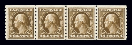 550 og 395 image#395, 4c Brown coil, perf. 8 1/2 vert., attractive guide line strip of four, especially fresh, intense rich color, well centered, clean o.g., lightly hinged in the end stamps, left stamp of guide line pair with the barest trace of hinging, other stamp n.h., very fine; 1988 PF certificate stating by omission that the guide line pair is n.h.. (Image) $600.00+