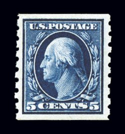 551 nh 396 image#396, 5c Blue coil, perf. 8 1/2 vert., exceptionally well centered and margined, deep luxuriant color and an especially intense impression on fresh white paper, o.g., n.h., extremely fine and a gem coil single; 1996 PF certificate. (Image) $130.00