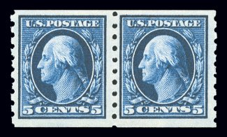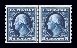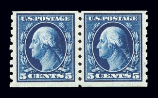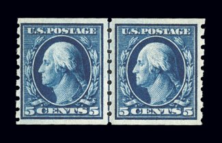 553 nh 396 image#396, 5c Blue coil, perf. 8 1/2 vert., pair, deep rich color, well centered, o.g., n.h., tiny perf. tip scuff at right, otherwise choice very fine. (Image) $350.00