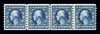 556 og 396 image#396, 5c Blue coil, perf. 8 1/2 vert., guide line strip of four, exceptionally fresh with luxuriant deep color, wonderfully well centered, o.g., lightly hinged, very fine; 1988 PF certificate. (Image) $545.00+