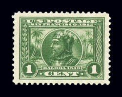 557 nh 397 image#397, 1c Panama-Pacific, a striking mint single, featuring huge margins all around and being absolutely perfectly centered within these vast borders, intense color and impression on immaculate white paper, o.g., n.h., an extremely fine gem; 2006 PSE certificate (XF-Superb 95 Jumbo). (Image) $45.00