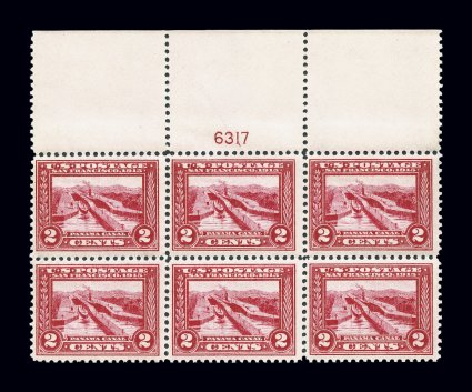 558 ogPB 398 image#398, 2c Panama-Pacific, full top margin plate no. 6317 block of six, intensely rich color, attractively centered, o.g., light gum glazing from a mount and some separated perforations at bottom, fine-very fine. (Image) $325.00