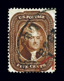 41 O 28A image#28A, 5c Indian red, Ty. I, used, better centering than usually found on this very scarce stamp, lovely rich color in the distinctive Indian red shade, sharp impression as well, light town c.d.s. and a portion of a red transit pmk., minute tear at bottom which is nearly undetectable, very fine appearance; 2000 PF certificate. (Image) $3,575.00