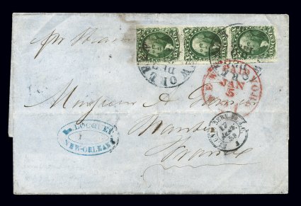 47 c 31,32,33 image#31, 32, 33, 10c Green, Ty. I, II, III combination strip of three, positions 80/90/100R1, the latter position being a Ty. I double transfer, scissors cut from sheet, tied by New Orleans c.d.s. pmks. and small part of a New Orleans red Paid on folded cover to France (backstamps), small cover stain just affects the top of the Ty. II stamp, otherwise a fine cover and a rare combination strip which is listed but unpriced in Scott. (Image) Est. 400-500