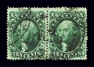 48 O 32 image#32, 10c Green, Ty. II, used horizontal pair, well centered and margined, excellent color that is an especially deep and intense shade, neat town c.d.s. pmks., very fine. (Image) $625.00