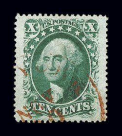 50 O 34 image#34, 10c Green, Ty. IV, position 86L1, recut at top, a most impressive used example of this rare type, featuring extraordinarily wide margins which are most uncharacteristic, plus it is essentially perfectly centered within these large margins, bright rich color, bold circular grid cancel, extremely fine; one of the largest margined examples of a perforated Ten Cent Type IV we have seen; 1979 and 2000 PF certificates. (Image) $2,250.00