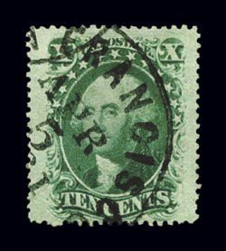 52 O 35 image#35, 10c Green, Ty. V, an incredibly attractive used example, possessing enormously wide margins and being marvelously well centered within them, exceedingly fresh as well, with rich luxuriant color and a crisp impression on fresh paper, cancelled by a light red town c.d.s., an extremely fine gem in every regard; 1984 and 2005 PF certificates. (Image) $72.50