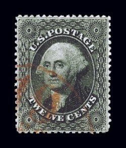 54 O 36 image#36, 12c Black, plate I, a spectacular used example that possesses numerous eye-arresting qualities, including its color, which is incredibly deep and intense, with a prooflike impression on bright paper, outstanding centering as well, which is rarely encountered on this terribly difficult value, all wonderfully complemented by a bright red cancel, an extremely fine gem for the finest used collection; 1997 PF certificate. (Image) $360.00