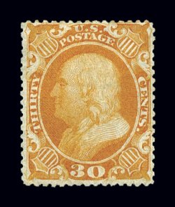 58 og 38 image#38, 30c Orange, well centered within large margins for this notoriously difficult stamp, strong rich color and a crisp impression, part o.g., very fine; 2005 PF certificate. (Image) $2,250.00