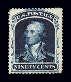 60 og 39 image#39, 90c Blue, an exceptionally choice mint example of this rare high value, being marvelously well centered within uncharacteristically large margins, deep rich color and a crisp impression, full clean o.g. that is also very lightly hinged, extremely fine; this value is very seldom encountered both in this superior quality and still retaining its original gum; 2004 PF certificate. (Image) $3,500.00