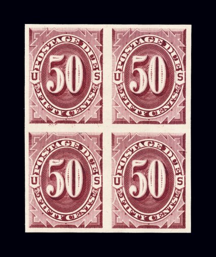 910 nh J28 image#J28, 50c Bright claret, a stunning mint single that ranks among the finest available examples, as it features numerous desirable attributes that rarely converge on a single stamp, including being exceedingly well centered within uncharacteristically large margins, but just as impressive is the stamp's spectacular color, which is an incredibly deep vibrant shade, prooflike impression as well, the reverse features immaculate o.g. which has never been hinged, extremely fine; a gorgeous gem for the connoisseur; 2000 PF and PSE certificates. (Image) for hinged $600.00