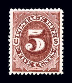 905 nh J25 image#J25, 5c Bright claret, an eye-appealing mint single, possessing striking intense color and a prooflike impression on brilliantly white paper, plus it is extraordinarily well centered within uncharacteristically large margins, immaculate o.g., never hinged, an extremely fine gem; 1997 PF certificate for a block of four, this being the top left stamp. (Image) for hinged $100.00