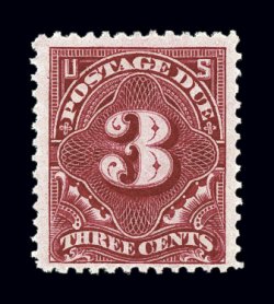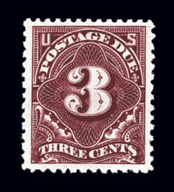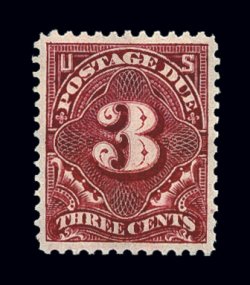919 og J47 image#J47, 3c Deep claret, a remarkably choice mint example of one of the most difficult postage dues to find in premium quality, featuring outstanding centering amid considerably larger margins than typically found, plus its rich luxuriant color is in a most appealing bright shade, o.g., very lightly hinged, extremely fine in every respect; a truly rare stamp in this exceedingly choice condition; 1995 PF certificate. (Image) $625.00