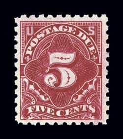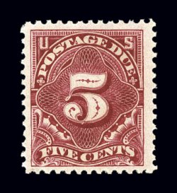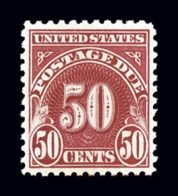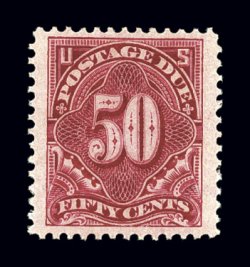924 nh J50 image#J50, 50c Deep claret, an especially desirable mint example of this scarce postage due, featuring incredibly wide margins and being wonderfully well centered within these huge borders, sumptuously rich color and a well incised impression, flawless o.g., never hinged, extremely fine; to find this high value both never hinged and this well margined is a particularly difficult challenge; 2004 PSE certificate (XF 90, which is the highest grade the PSE has assigned to this stamp). (Image) $2,600.00