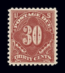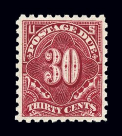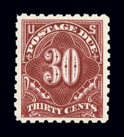 928 nh J57 image#J57, 30c Carmine lake, wonderfully well centered mint single, with exceptionally large margins which are most uncharacteristic of the perf. 10 postage dues, intense radiant color and prooflike impression on bright paper, pristine o.g., n.h., extremely fine; an especially scarce stamp in this choice condition; 1997 PF certificate. (Image) $525.00