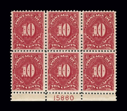 930 nhPB J65a image#J65a, 10c Rose red, full bottom margin plate no. 15860 block of six, remarkably well centered, brilliant color being a lovely example of this shade, pristine o.g., n.h., very fine. (Image) $310.00
