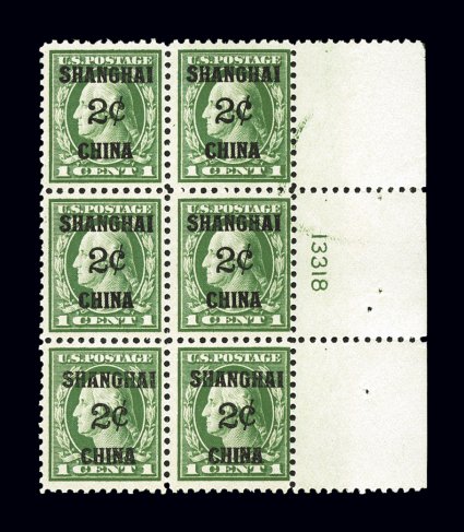 933 ogPB K1 image#K1, 2c on 1c Green, full right margin plate no. 13318 block of six, incredibly deep luxuriant color on bright white paper, rather well centered for this, o.g., lightly hinged in the two right row stamps, the other four are n.h., fine-very fine; a rather scarce plate number as only two of the eight positions are known from this plate, this being the upper right position. (Image) $300.00