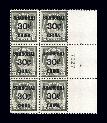 942 ogPB K12 image#K12, 30c on 15c Gray, full right margin plate no. 7927 block of six, crisp and intact, strong color, o.g., lightly hinged, fine-very fine; a very difficult plate block. (Image) $1,150.00
